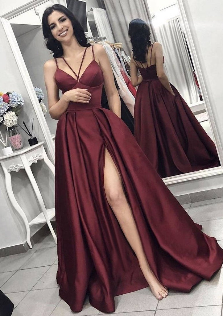 فستان حفلة رسمي طويل من الساتان المرن بدون أكمام مع حمالات على شكل حرف A وفتحة على شكل حرف V