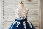 79 دولارات من طراز SALE: Ivory Lace Navy Blue Tulle Wedding Flower Girl Dress with V Back