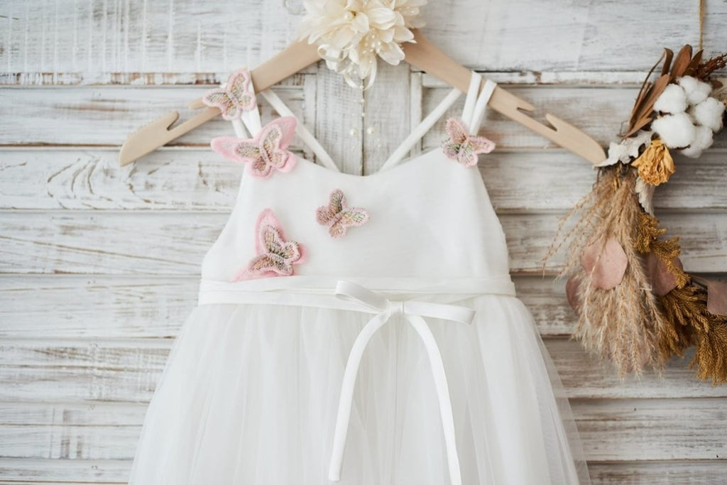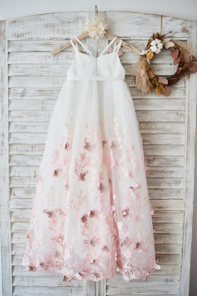 فستان زهرة فتاة لحفلات الزفاف بأشرطة السباغيتي من التول العاجي ، فراشات ثلاثية الأبعاد