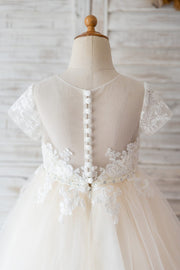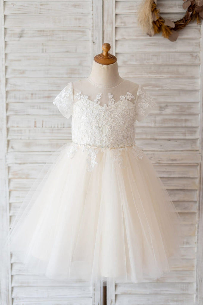 الأميرة قصيرة الأكمام الدانتيل العاج الشمبانيا تول فستان الزفاف زهرة فتاة