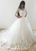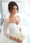 قبالة الكتف الكرة ثوب مصلى الدانتيل فستان الزفاف الزفاف ، الطيات