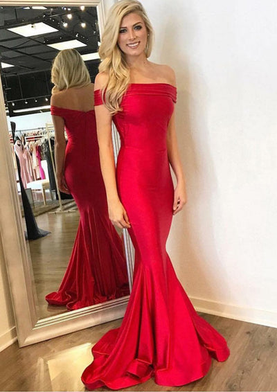 Mermaid Off Shoulder Straight Neck Sweep Red Elastic Satin Evening Dress