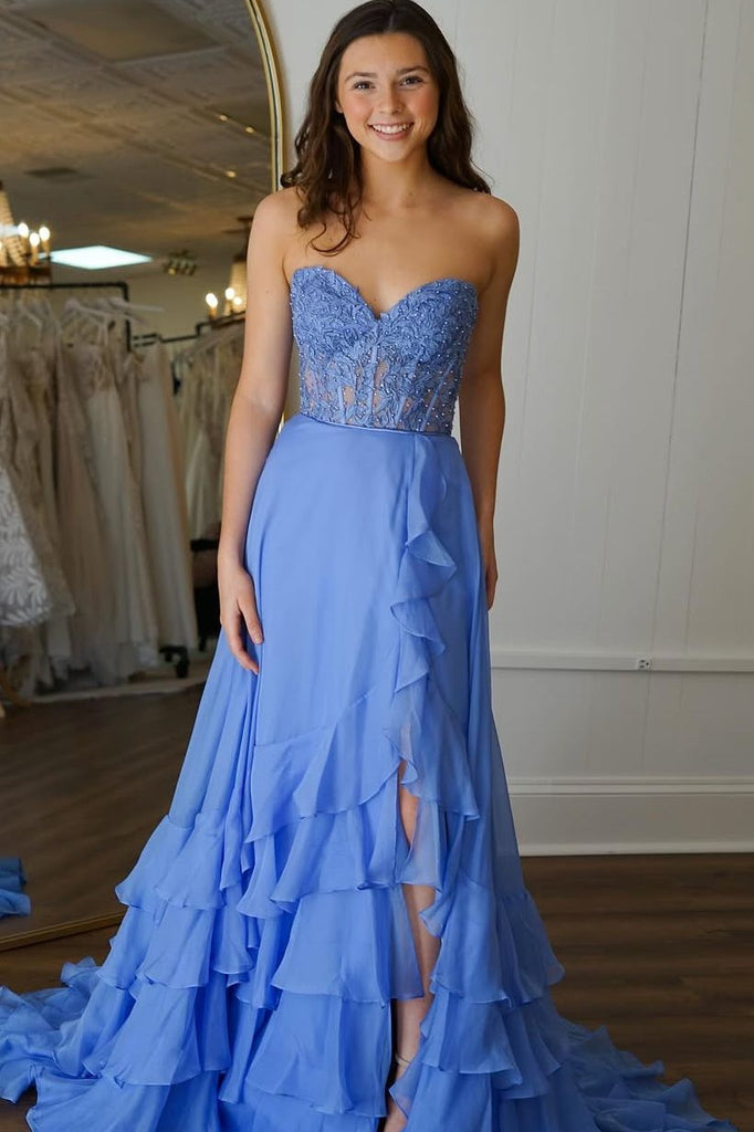 A-Line Strapless V-Neck Lace Ruffles Chiffon Long Prom Party Dress