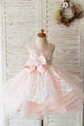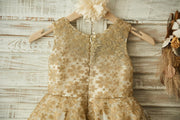 Princess Gold Lace Ivory Tulle Scoop Neck Wedding Flower Girl Dress