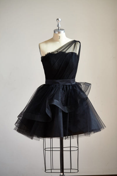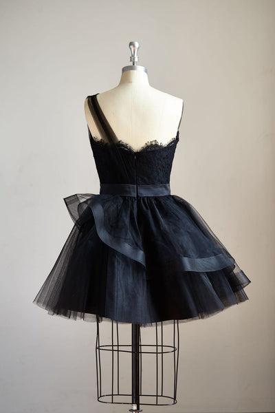 One Shoulder Black Lace Tulle Short Knee Prom Dress Cocktail Party Dress