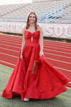 A-Line Strapless Bow Sleeveless Cut-out Red Satin Long Prom Dress, Slit