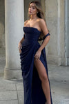 Navy Blue Strapless Pleats Sleeveless High Slit Long Party Prom Dress