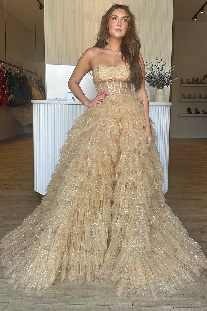 - Features a sheer bodice and a beautiful ruffle-tiered skirt;