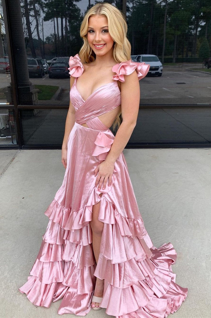 V-neck Red Satin Cutout Ruffle A-Line Slit Court Long Prom Dress