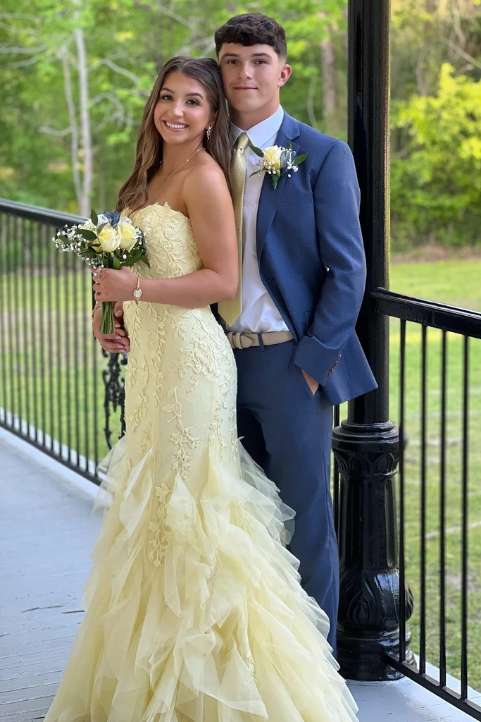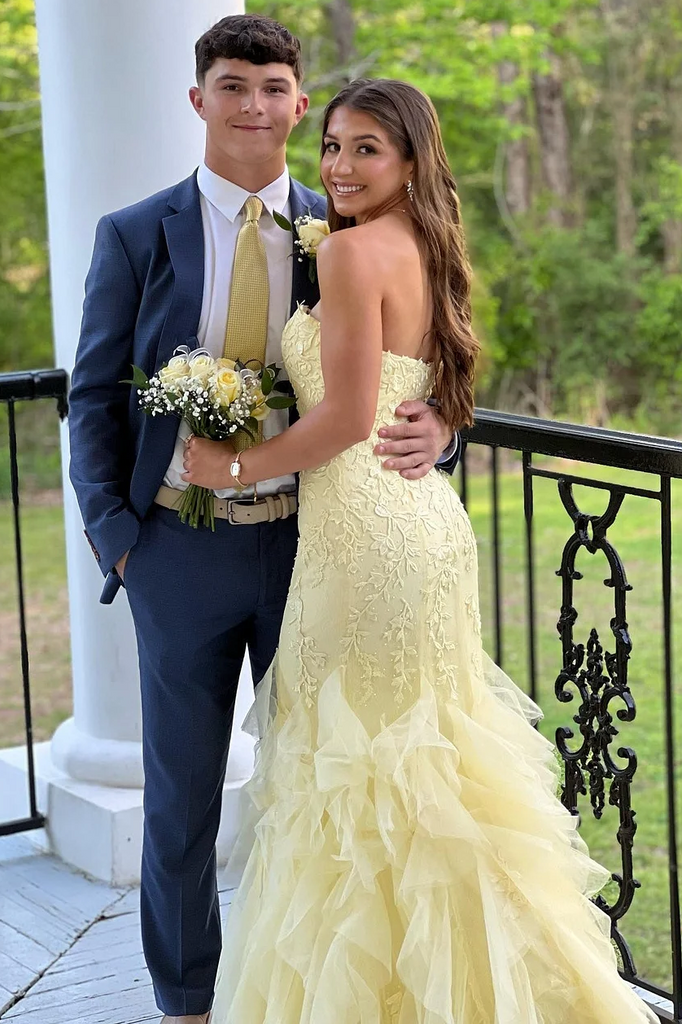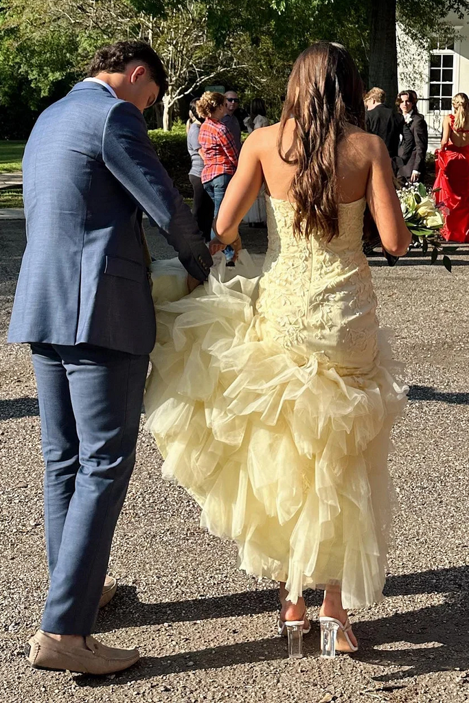 Yellow Strapless Sleeveless Ruffles Lace Tulle Long Prom Dress