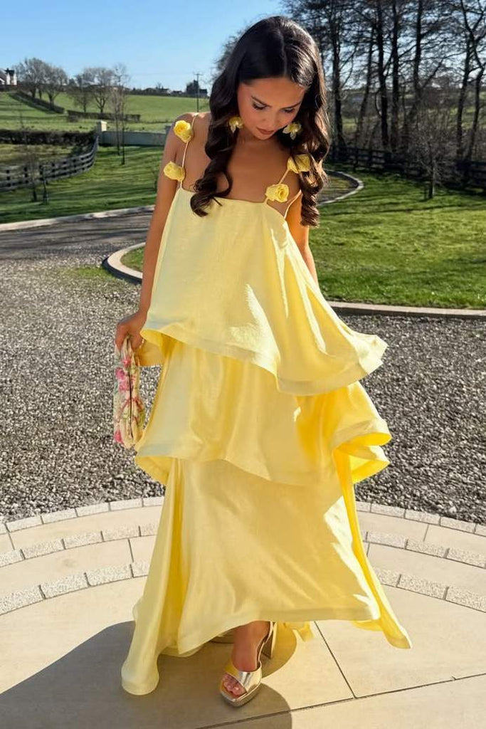 Yellow Straps A-Line Ruffles Satin Sleeveless Formal Prom Dress, Flower
