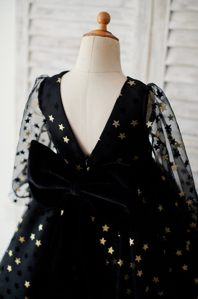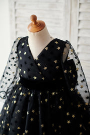 Schwarzes Gold Star Tüll V zurück lange Ärmel Hochzeit Blumenmädchenkleid