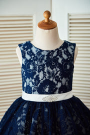 Prinzessin Marineblau Spitze Elfenbein Tüll Hochzeit Blumenmädchenkleid