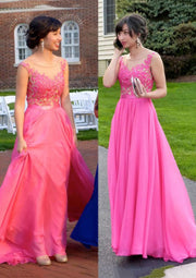 Chiffon Langes A-Linie Ärmelloses Bateau Prom Party Abendkleid, Spitze