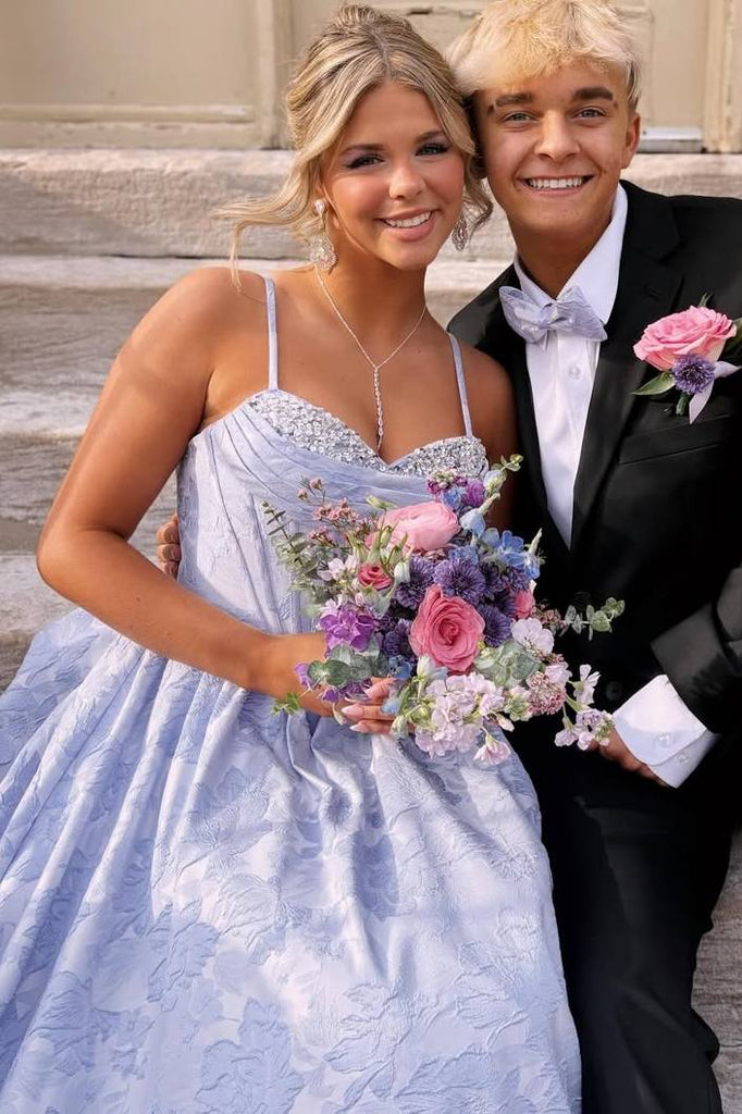 Spaghetti Straps A-Line Floral Satin Beaded Formal Prom Dress