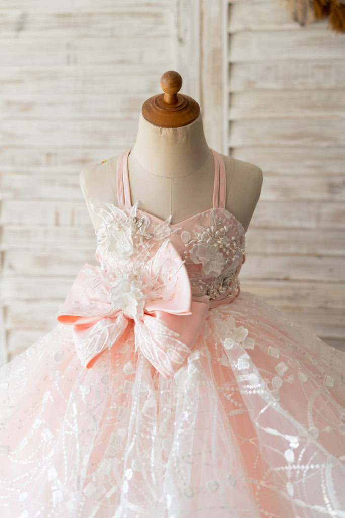 Vestido de niña de las flores de la boda de la espalda cruzada de las correas de encaje con cuentas de tul rosa Vestido formal de los niños