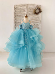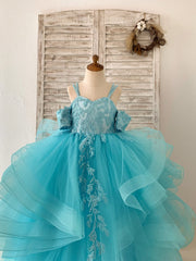 Vestido de niña de flores de boda de tul de encaje verde azulado con hombros descubiertos y correas de crin de caballo