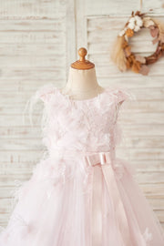 Vestido de niña de las flores de boda con espalda en V de tul de encaje rosa, pluma