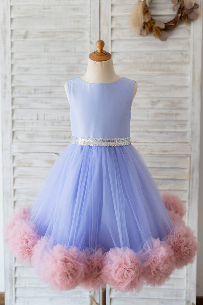 V espalda lavanda satén tul malva volantes dobladillo boda vestido de niña de las flores