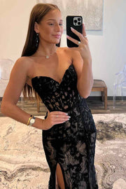 Vestido de Promoción de Encaje Negro con Corsé de Funda, Sin Tirantes, Escote Corazón, con Cola Larga y Abertura