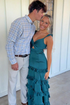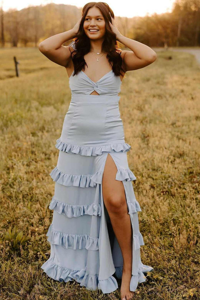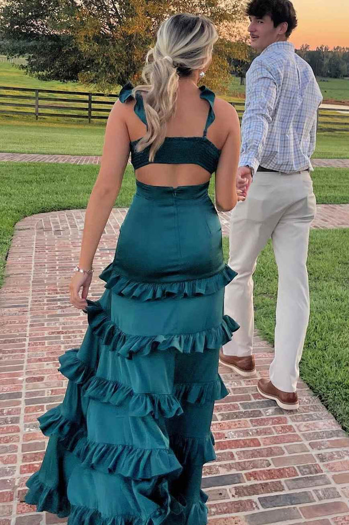 A-line V-Neck Straps Satin Cut Out Tiered Ruffles Slit Formal Prom Dress