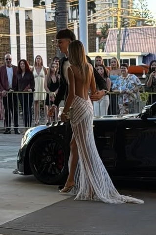 Beaded Straps Backless Mermaid Tulle Long Sweep Evening Prom Dress