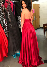 Sexy A-ligne Croix Halter Sans Manches Balayage Train Fente Charmeuse Robe De Soirée De Bal