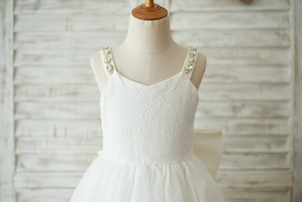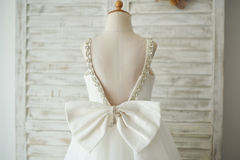 Robe de demoiselle d'honneur de mariage en dentelle ivoire avec dos en V profond, nœud