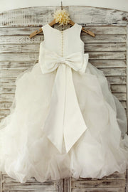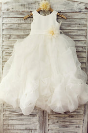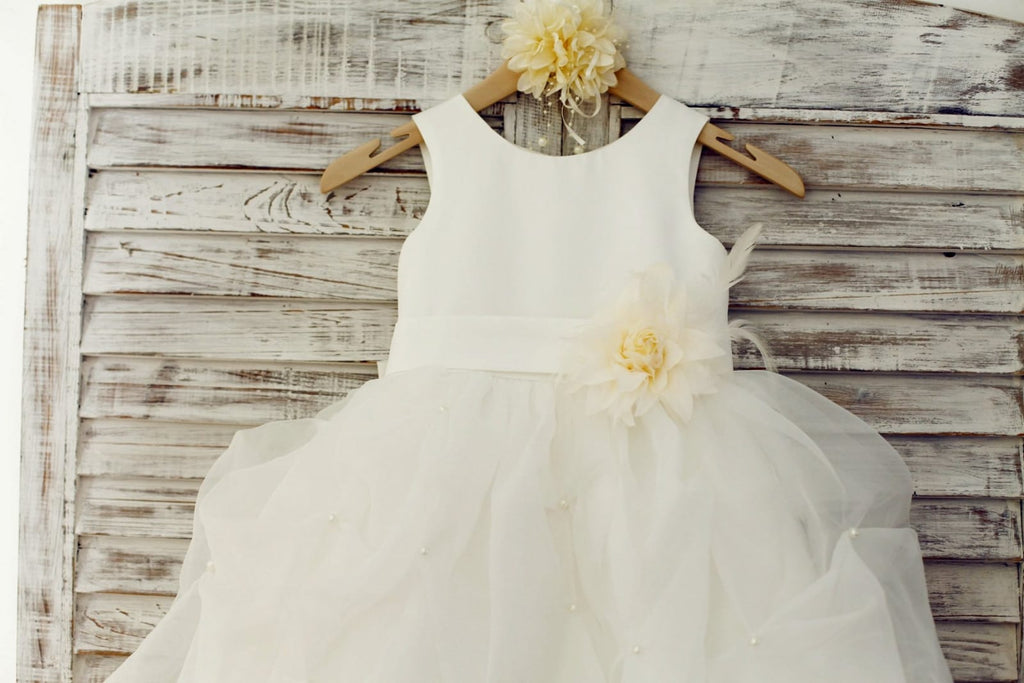 Robe de demoiselle d'honneur en organza satiné ivoire à volants, fleur de plumes