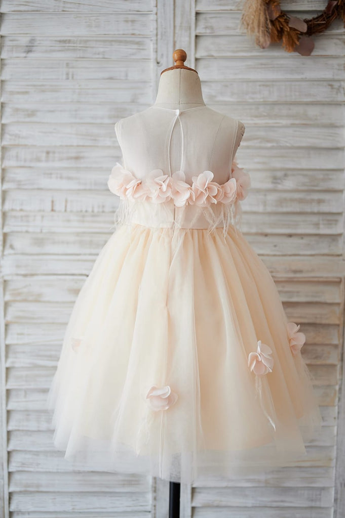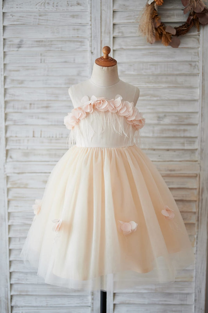 Illusion Champagne Tulle Feathers Wedding Party Flower Girl Dress