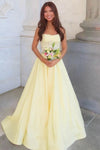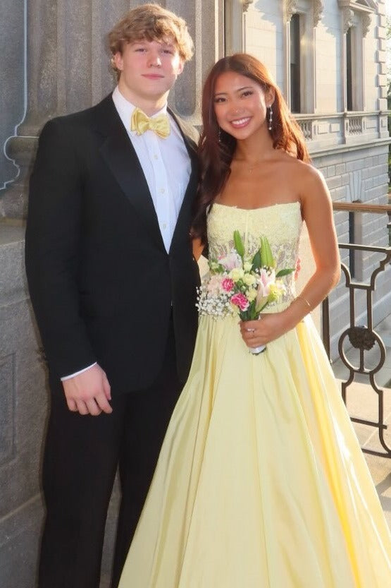 Yellow A-Line Strapless Lace Satin Pleats Long Sweep Prom Dress
