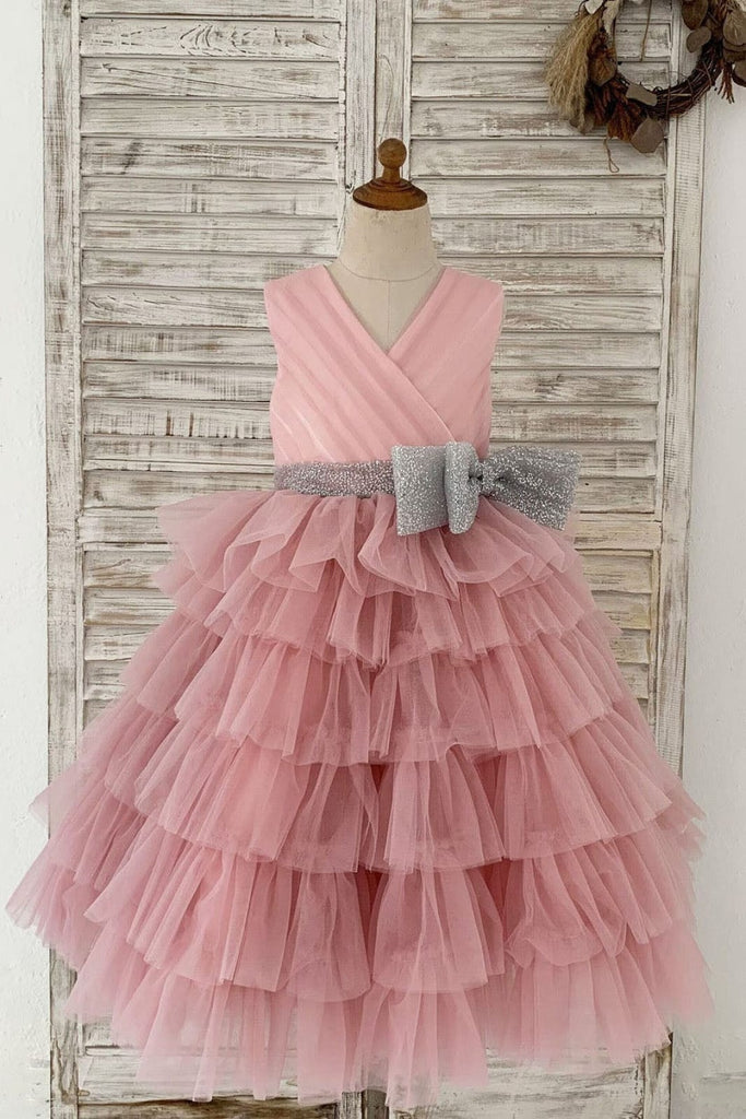 Abito da ragazza di fiore da sposa con scollo a V in tulle color malva Cupcake, fiocco scintillante