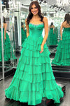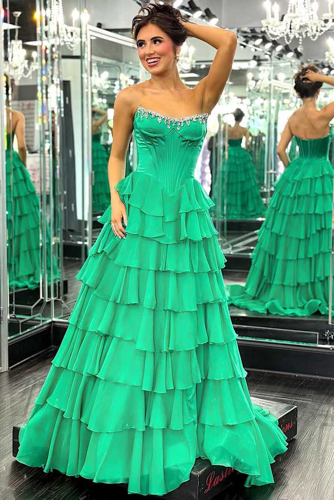 Green A-Line Strapless Scoop Beads Ruffles Layered Chiffon Prom Dress
