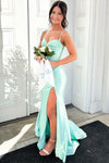 Mint Satin Pleats Sleeveless V-neck Straps Mermaid Prom Dress, Slit