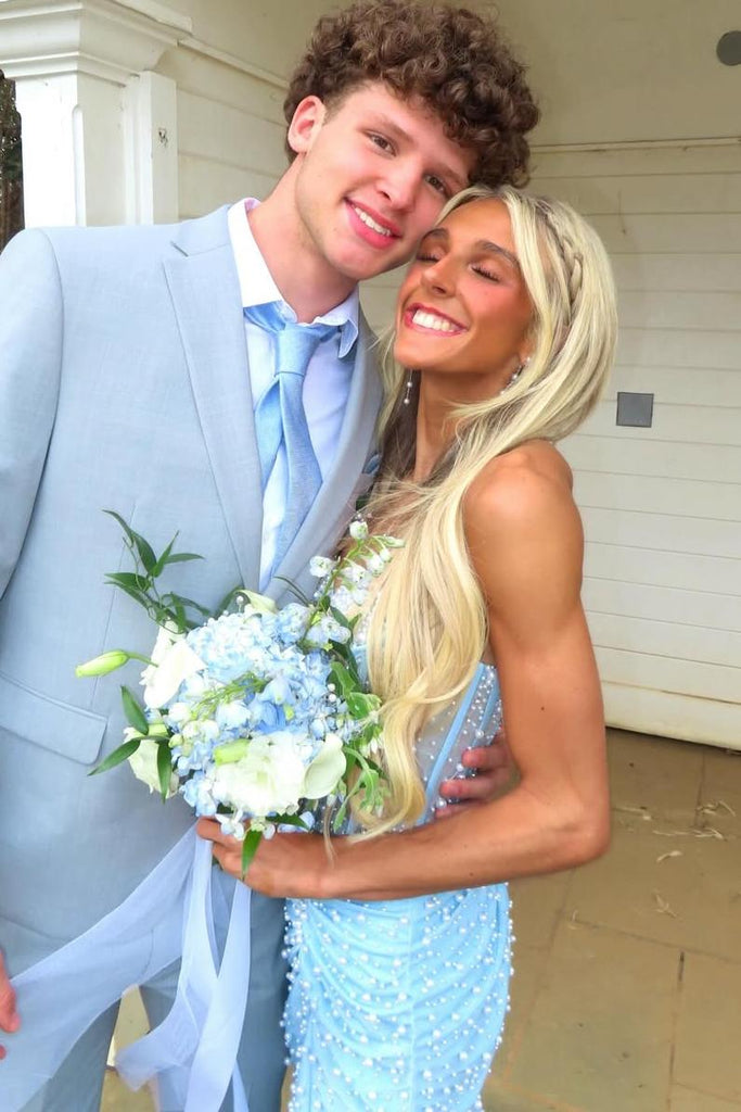 Blue Strapless Beaded Satin Tulle Mermaid Long Prom Dress, Slit