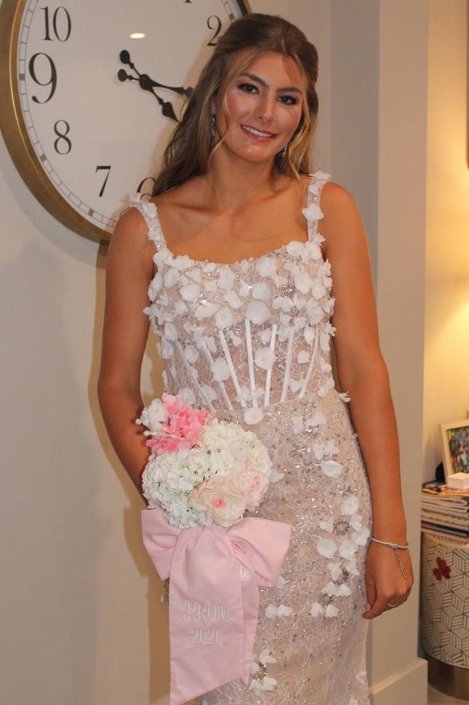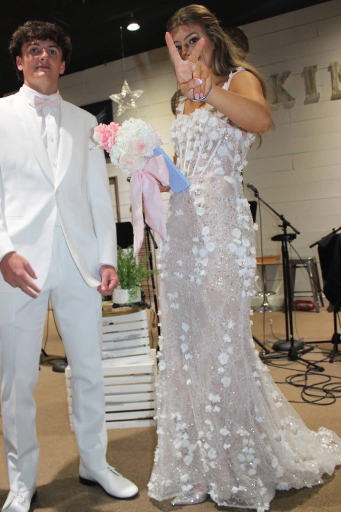 Beaded Flowers Scoop Neck Straps Lace Satin Mermaid Long Prom Dress