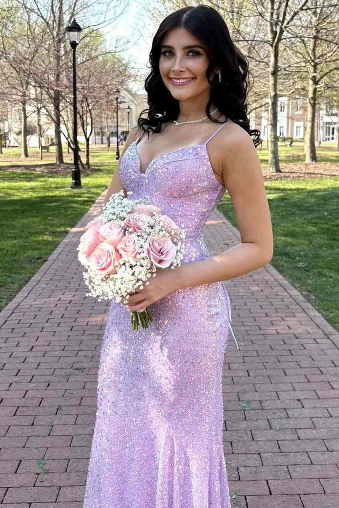 V-Neck Straps Sequined Satin Sleeveless Sparkly Party Prom Dress