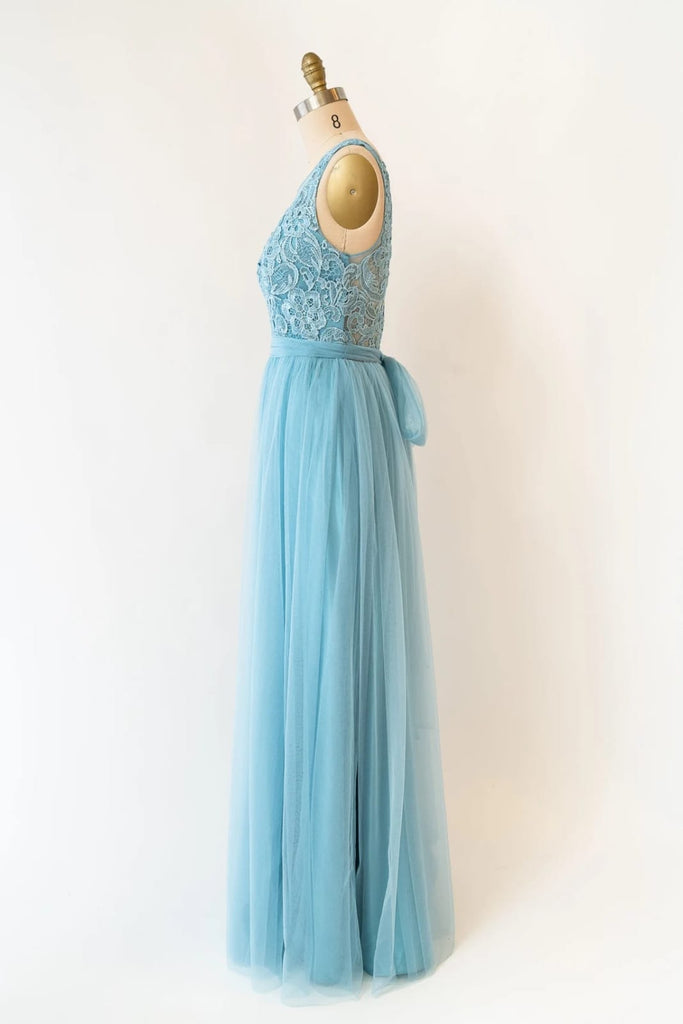 シアーレース チュール ディープVバック ロング ライトブルー ブライズメイドドレス サッシュ