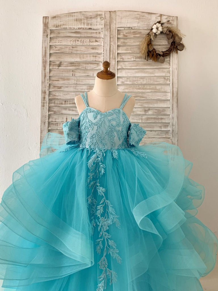 ティール レース チュール オフショルダー ビーズ ストラップ ホースヘア ウェディング フラワー ガール ドレス