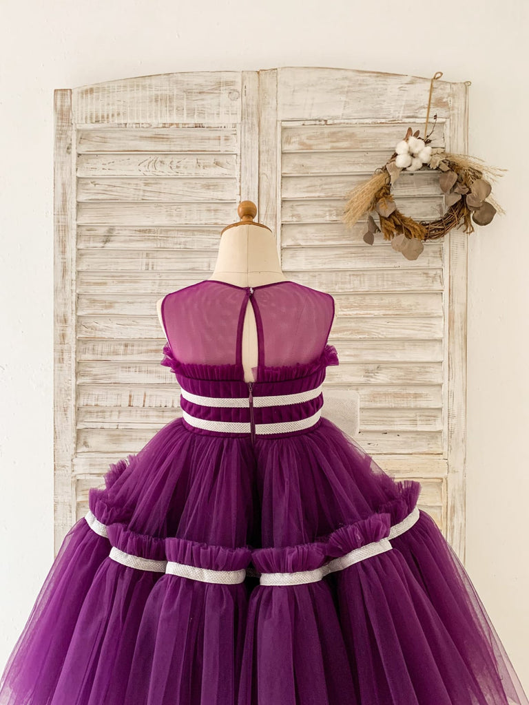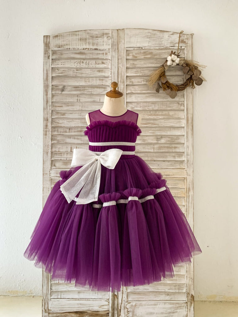 プリンセス シアー ネック プリーツ パープル チュール ウェディング フラワー ガール ドレス キッズ パーティー、弓