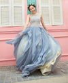 Keywords: blue ball gown, ruffle gown, princess dress, wedding guest dress, formal gown, layered dress