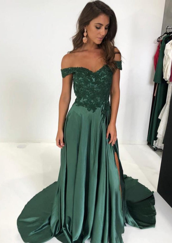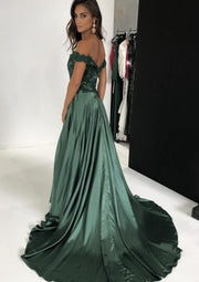 A-line Off Shoulder Sweetheart Court Emerald Green Lace Charmeuse Prom Dress, Split
