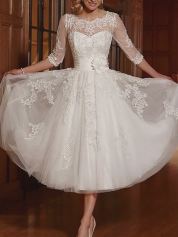 Bridal Shower A-Line Wedding Dress Tea Length 3/4 Sleeve Lace Bridal Gown