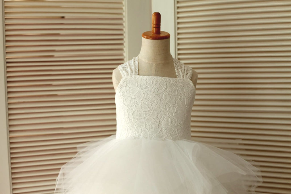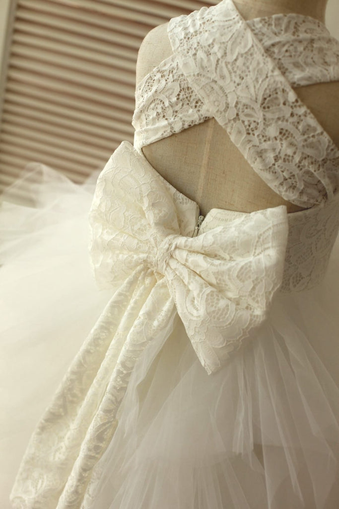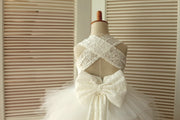 Cross Back Ivory Lace Ruffle Tulle Skirt Flower Girl Dress, big bow