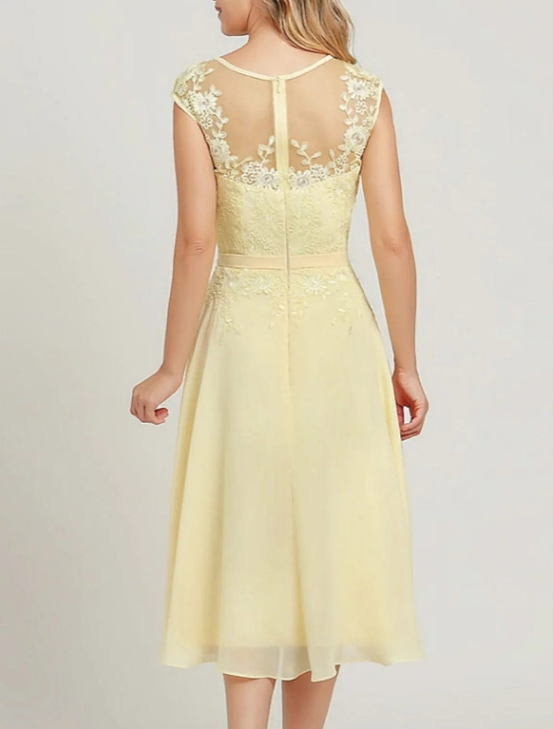 - The dress is a-line silhouette, scoop neckline, sleeveless & sheer back;