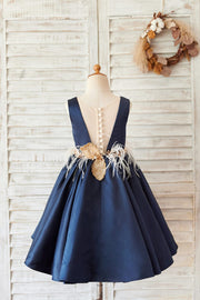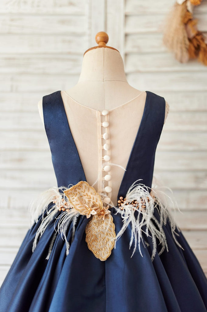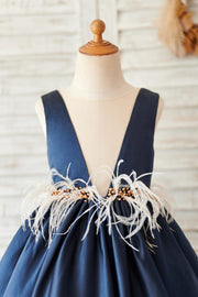 Vestido de festa de casamento de cetim azul marinho com decote em V, pena