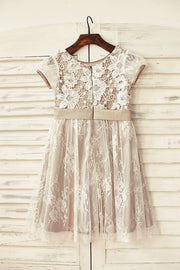 Vestido de florista marrom cetim marfim de renda manga curta