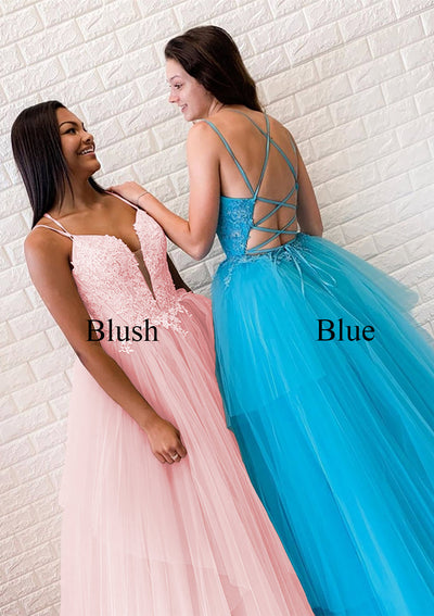 Vestido de Baile de Princesa com Decote em V, Alças Finas Cruzadas nas Costas, Longo, de Tule, para Prom, Renda