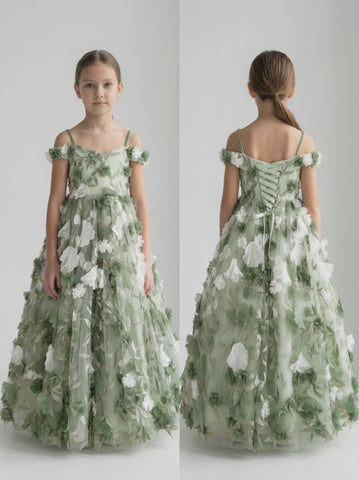 Princesa 3D bordado floral verde tule até o chão vestido de flor de casamento