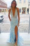 Halter Plunging Lace Satin Sleeveless Backless Mermaid Prom Dress, Slit